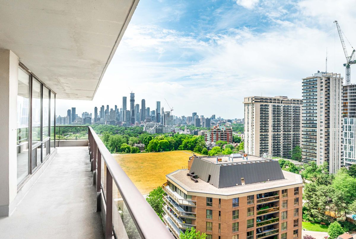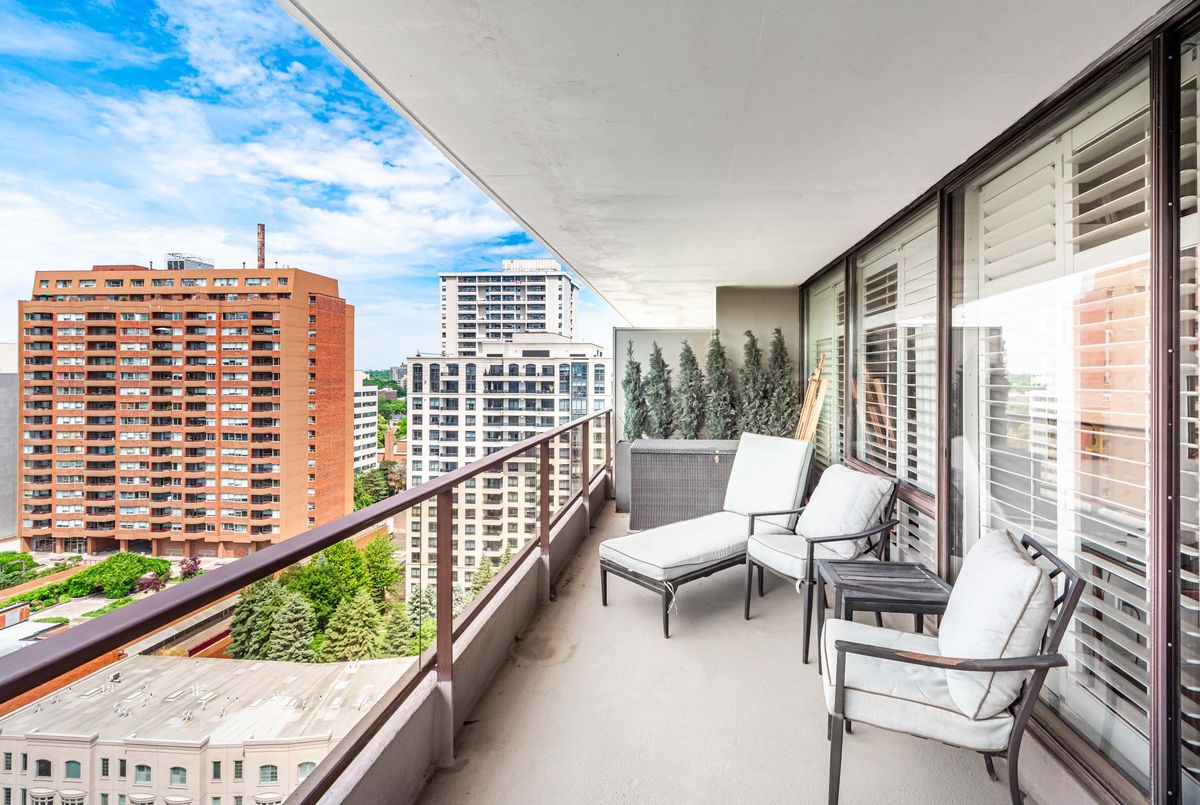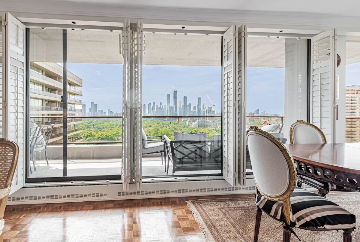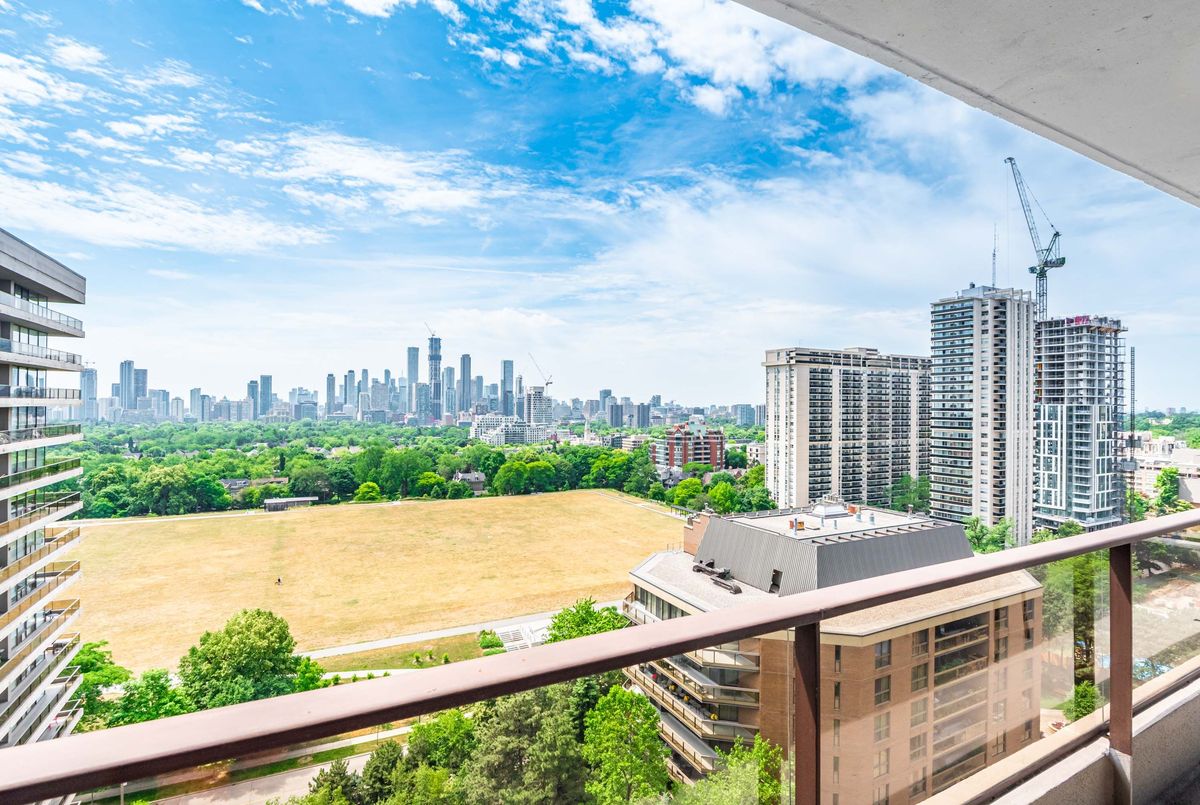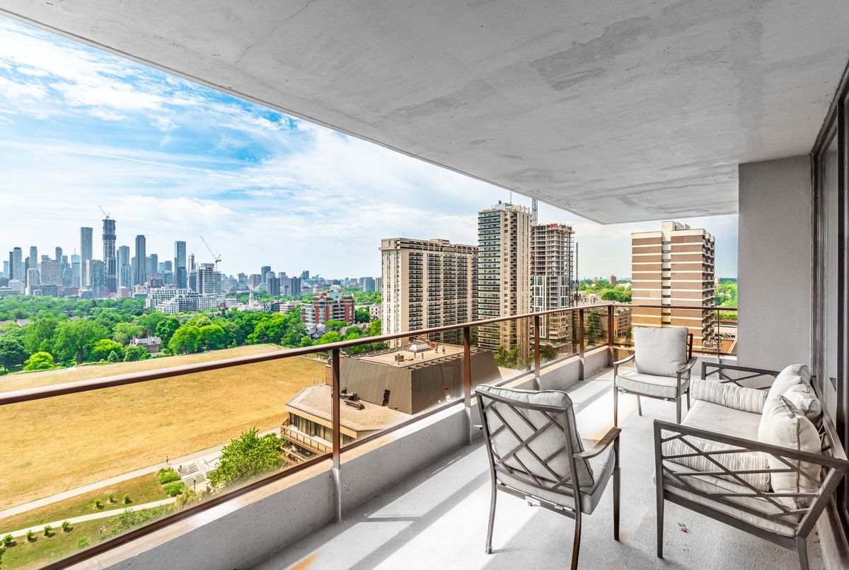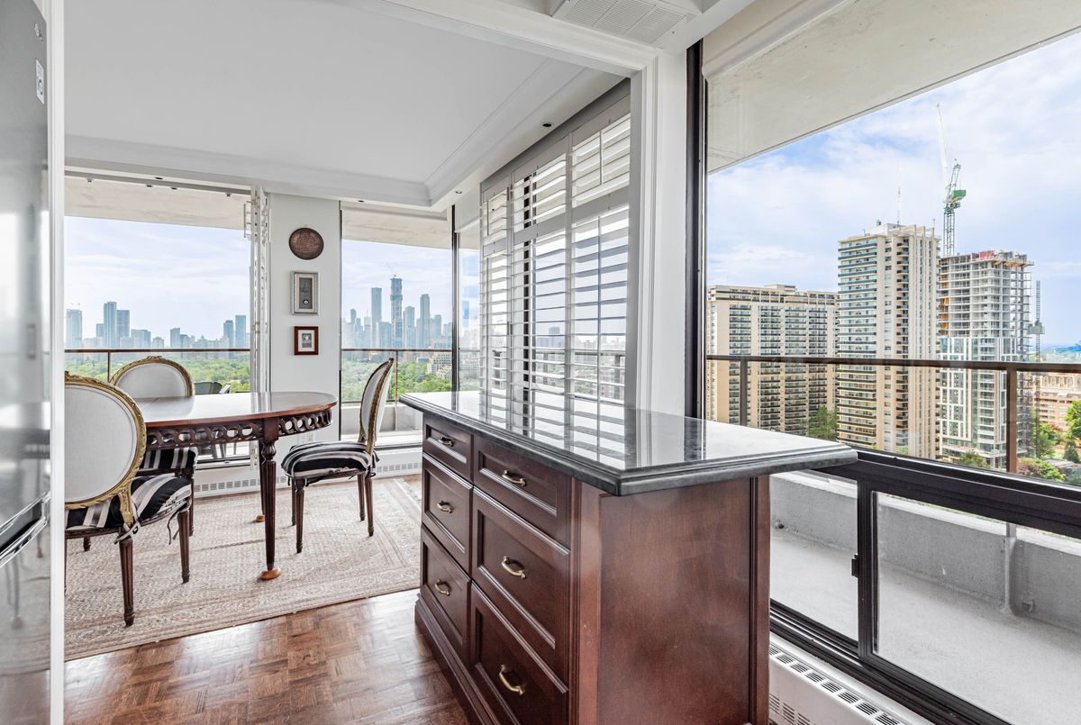 Soaring above the tree-tops with clear views of the south city skyline and David Balfour Park, this stunning corner suite offers an exceptional lifestyle in a coveted midtown location. Rarely offered, this 2-bedroom, 2-bathroom residence boasts approximately 1,106 sq.ft. of interior living space plus 474 sq.ft. of outdoor space. A beautifully proportioned layout includes multiple walk-outs to a wraparound balcony, perfect for enjoying morning coffee or evening sunsets. Floor-to-ceiling windows flood the open-concept living and dining area with natural light, enhancing the airy, inviting atmosphere. The modern kitchen is both stylish and functional, outfitted with black granite countertops, a sideboard for extra storage and prep space, and an integrated eating counter. The spacious primary bedroom includes a walk-in closet and a renovated 3-piece ensuite bath. The second bedroom, complete with a double closet, enjoys access to its own updated 3-piece bathroom perfect for guests or shared living. Residents of this well-managed co-op building enjoy an array of luxury amenities: 24-hour concierge, on-site property management, a serene outdoor pool surrounded by mature trees and manicured grounds, an exercise room, hobby room, library, party/meeting room, laundry facilities, EV charging stations, car wash bay, bike storage, and ample visitor parking. Underground rental parking space, as available and the use of one out-of-suiite storage locker for added convenience. Ideally located just steps to the Yonge/St. Clair subway, shops, cafes, dining, the public library, and nearby ravine trails, this home blends the best of urban living with the tranquility of a park-side setting. The maintenance fee includes: property taxes, hydro, heat, water, central air, basic cable TV, internet, building insurance and common elements. Note: Avoca Apartments Limited does not permit pets, rentals, or ensuite laundry.