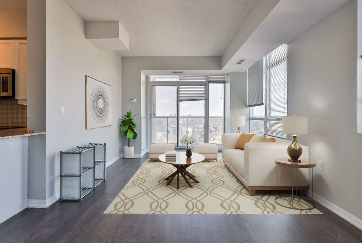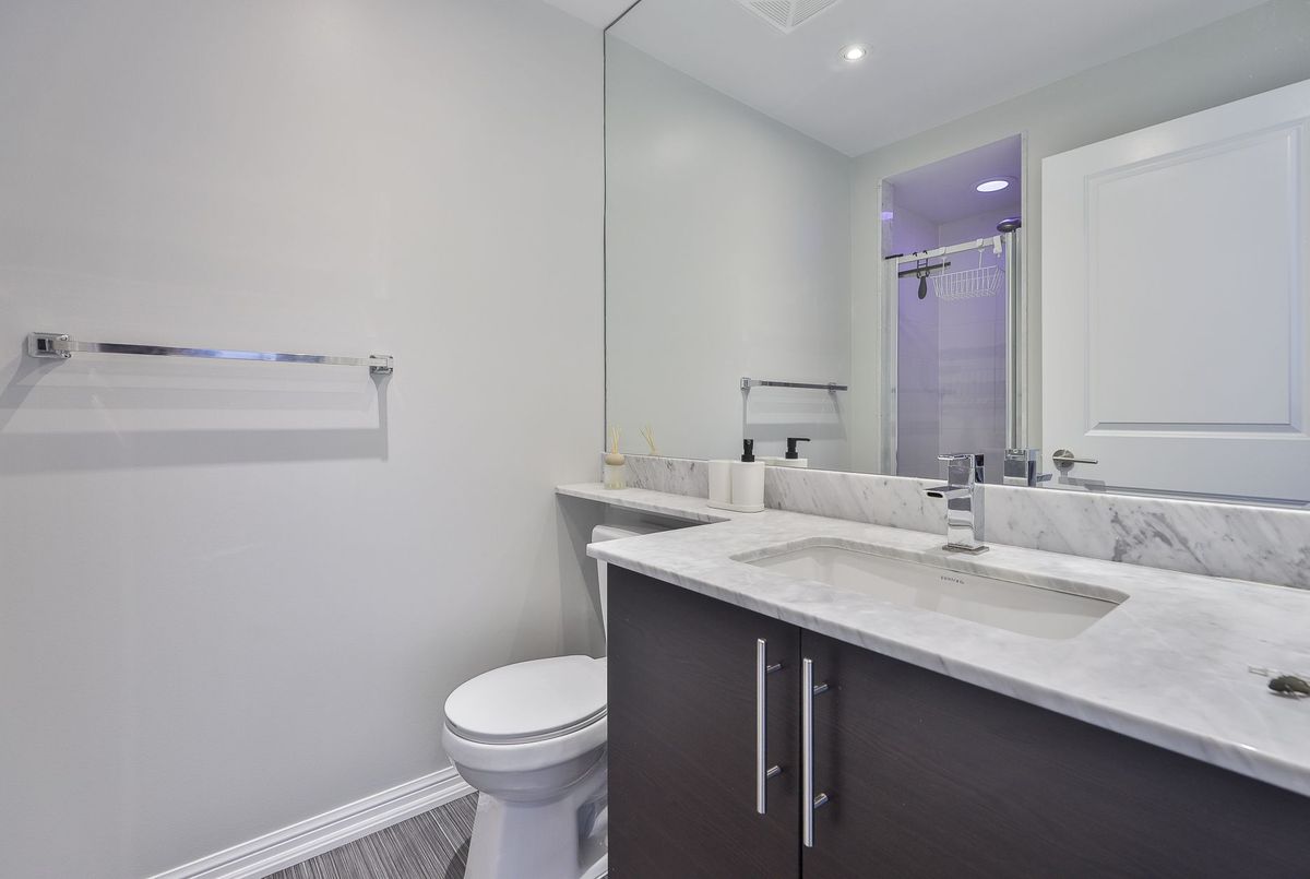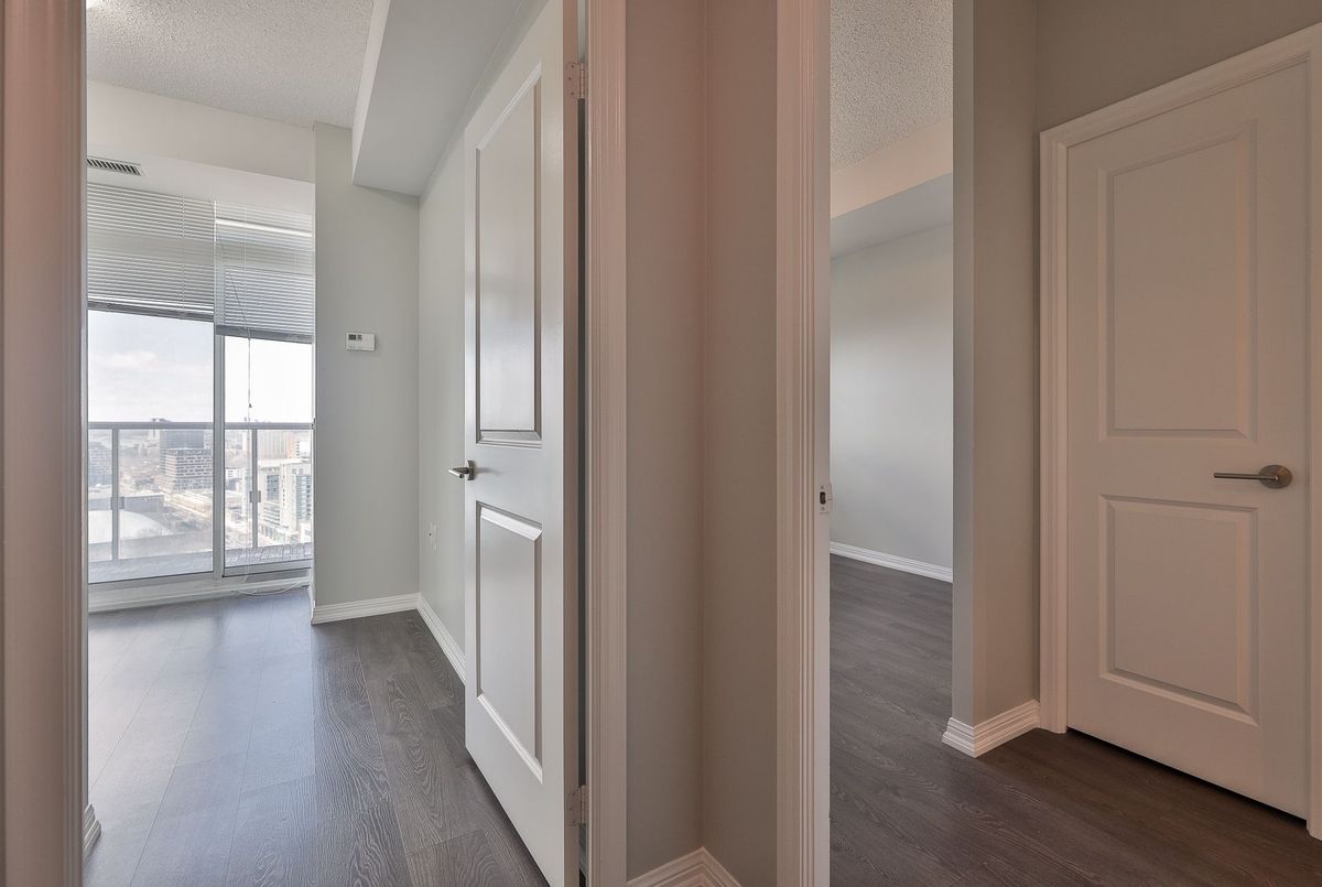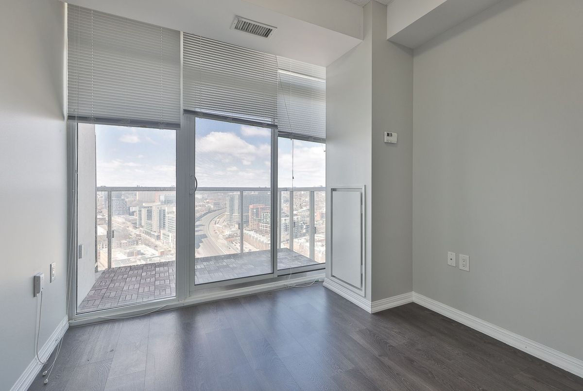 A rare offering in Liberty Village-this is the one buyers wait for.Units of this size rarely come to market-this is the first in over a year. Perched on the 28th floor with over 1,000 sq ft and not one, but two private balconies, this suite delivers panoramic city views from every angle and true indoor-outdoor living.Step inside to a freshly painted, sun-filled true 2-bedroom + oversized den, 2-bath layout designed for both comfort and functionality. This is not a token den-it's a fully usable, large separate space, perfect for a home office, guest area, or even a third bedroom setup.The open-concept living and dining space flows seamlessly to one of the balconies, creating an elevated lifestyle rarely found in condo living. The modern kitchen features stainless steel appliances, stone countertops, and ample cabinetry-ideal for both everyday living and entertaining.The primary bedroom is a true retreat, complete with its own private balcony, large closet, and ensuite bath. A well-sized second bedroom and second full bathroom round out a layout that truly stands apart from typical Liberty Village units.1 parking and 1 locker included-adding real convenience and value.Located in the heart of Liberty Village, you're steps to top restaurants, cafes, fitness studios, parks, and transit, with access to premium building amenities including a gym, indoor pool, concierge, and more.If you've been waiting for a large, functional condo with real outdoor space and a usable den in Liberty Village-this is it