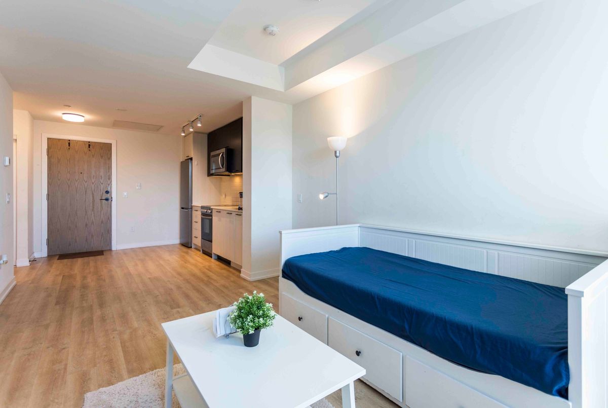 (Open house every Sat/Sun 2-4pm by appointment only.) Welcome to Stockyard Condos by Marlin Spring Developments nestled in the heart of The Junction a prestigious Toronto neighbourhood. Located on the 3rd floor with a South exposure, this spacious 1 bedroom + den suite offers 590 sq ft of living space, tons of natural light, modern finishes, laminate flooring throughout, ensuite laundry and an open concept balcony to unobstructed city views. The inviting open-concept living and dining areas are perfect for relaxation and entertainment. Enjoy the kitchen space thats equipped with contemporary stainless steel appliances, quartz countertops, and a stylish backsplash. The spacious bedroom features a large window and a sizeable closet space. An open-concept L-shaped den offers versatility for a home office or guest accommodation. Parking and locker are available at an additional cost. Vacation possession guaranteed. Building amenities include a 24-hr concierge, gym/exercise room, party/meeting room, outdoor terrace with BBQ area, visitors parking, electric car charging stations, games room and more. Conveniently located near TTC public transit, Stockyards Village, grocery & shopping plazas, restaurants, cafes, parks, banks & other local area amenities. Building allows short-term rentals. Vendor Take Back (VTB) available.